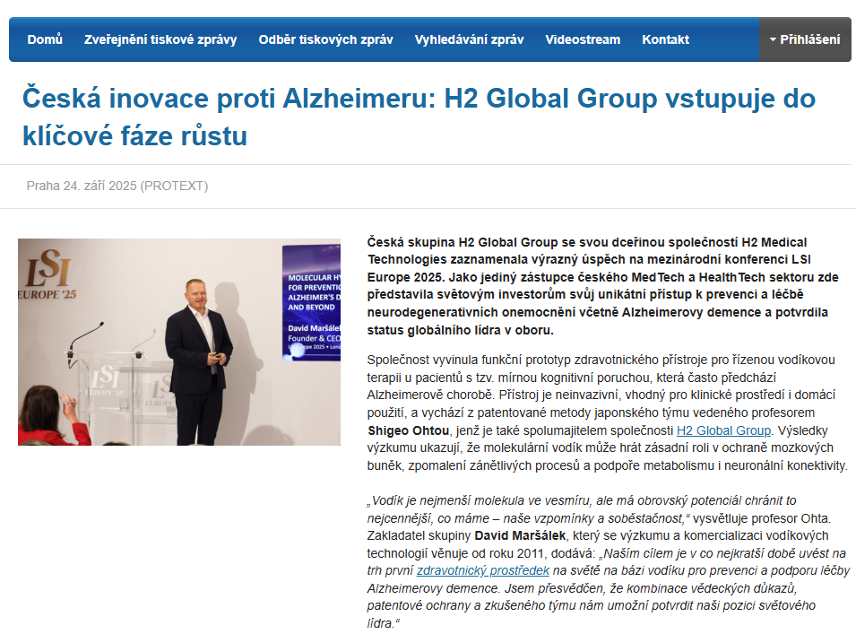 Česká skupina H2 Global Group se svou dceřinou společností H2 Medical Technologies zaznamenala výrazný úspěch na mezinárodní konferenci LSI Europe 2025. Jako jediný zástupce českého MedTech a HealthTech sektoru zde představila světovým investorům svůj unikátní přístup k prevenci a léčbě neurodegenerativních onemocnění včetně Alzheimerovy demence a potvrdila status globálního lídra v oboru.